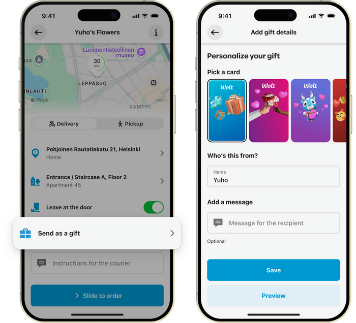 Испраќањето подарок е едноставно: се внесува адресата на примателот, се избира производ и при наплата се селектира опцијата „Send as a Gift“, по што се додава дигитална картичка, лична порака и контакт на примателот. Примателот добива SMS со пораката и линк за следење на доставата, а не му е потребен Wolt профил за да го прими подарокот.