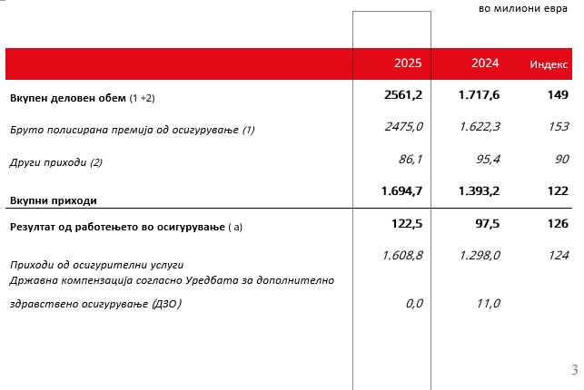 - Вкупниот деловен обем изнесуваше 53,2 милиони евра (2024: 56,2 милиони евра; го вклучува влијанието на еднократен настан*). Премијата за осигурување се зголеми за 19 проценти, на 52,8 милиони евра.