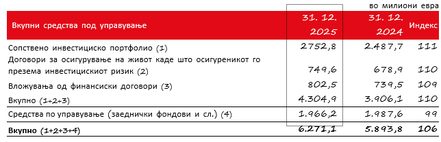 Вкупните средства под управување на Групација Триглав според структурата останаа на споредливо ниво како и на крајот од претходната година. Нивниот обем се зголеми за 6 проценти, на 6,3 милијарди евра. Во нестабилни услови на финансиските пазари, Групација Триглав оствари 2,6-процентна профитабилност на финансиските вложувања (2024: 3,0 проценти), без вложувањата во корист на осигурениците кои го преземаат инвестицискиот ризик. Профитабилноста во најголема мера е споредлива со претходната година, исклучувајќи го влијанието на курсните разлики врз инвестициите, кои се неутрализираат со промените во осигурителните резерви, како и влијанието на растот на работењето на италијанскиот пазар врз вредноста на финансиските вложувања.