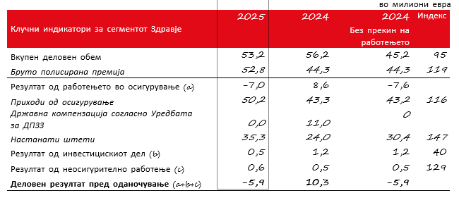 Вкупниот деловен обем на сегментот оваа година изнесуваше 53,2 милиони евра (за 5 проценти помалку отколку во 2024 година, кога беше зголемен поради ефектот од укинувањето на дополнителното здравствено осигурување). Пресметаната премија за осигурување, во износ од 52,8 милиони евра, се зголеми за 19 проценти. Нејзиниот раст беше остварен на сите пазари во регионот.