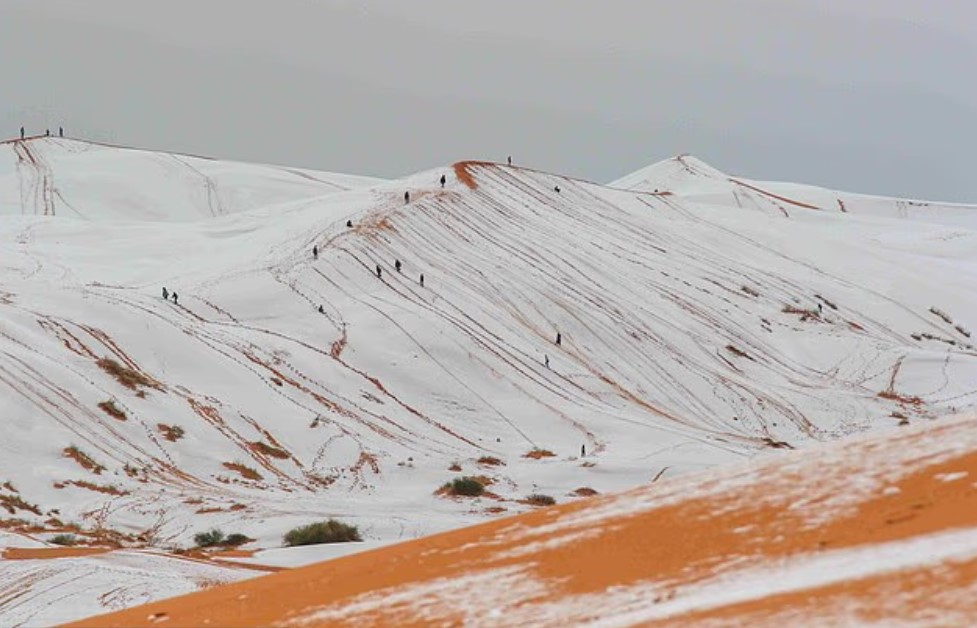 Во пустинскиот град Аин Сефра, на северот на Сахара, падна снег и изненади туристите и локалното население, а фотографиите од необичните сцени брзо се проширија по светот.