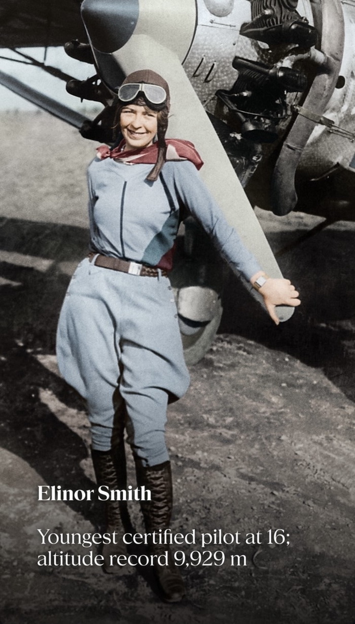 Младоста исто така знае да биде револуционерна сила. Елинор Смит имаше само шеснаесет години кога стана најмладиот лиценциран пилот во Соединетите Држави. Возраст кога повеќето луѓе допрва го откриваат светот, таа веќе леташе над него, поставувајќи и рекорд во височина на лет.