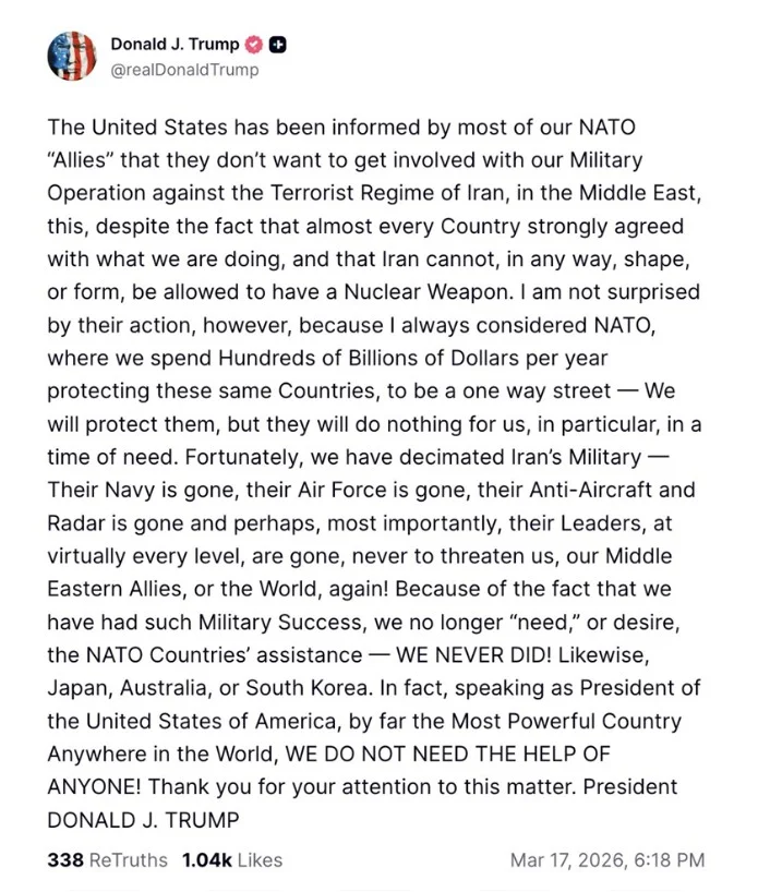 Претседателот на САД, Доналд Трамп, се огласи на социјалната мрежа Truth Social откако бројни западни земји го отфрлија неговото барање за воена помош за обезбедување премин низ Ормутскиот теснец.