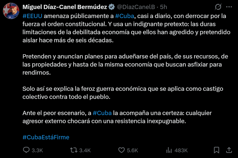 Во вторник, Дијаз-Канел рече дека САД ќе се соочат со „непопустлив отпор“ ако се обидат да ја преземат земјата. Во објава на Икс, Дијаз-Канел рече дека САД јавно ѝ се закануваат на Куба, речиси секојдневно, дека ќе го соборат уставниот поредок со сила. „Ова е единствениот начин да се објасни жестоката економска војна што се води како колективна казна против целата нација“, рече тој.