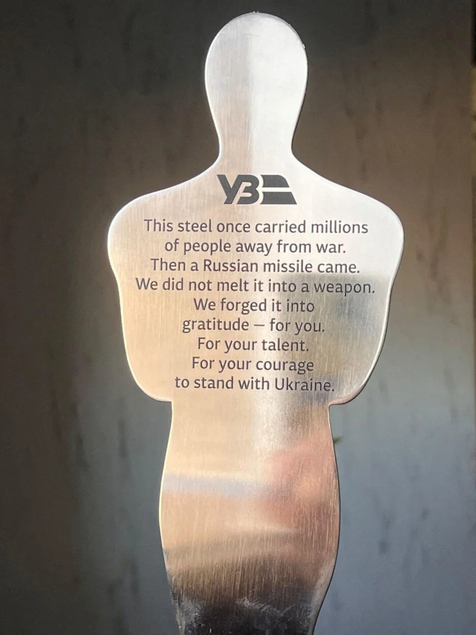 На наградата е врежана пораката: „Ова железо некогаш однесе милиони луѓе од војната. Потоа дојде руска ракета. Не го претопивме во оружје. Го исковавме како знак на благодарност за вас. За вашиот талент. За вашата храброст да стоите покрај Украина“.