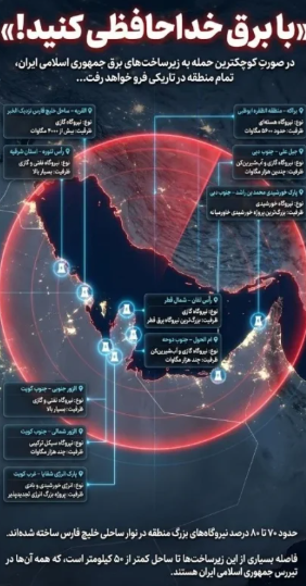 За да го потенцира своето предупредување, Мехр објави графика на персиски јазик со порака „Кажете збогум на електричната енергија“. Илустрацијата прикажува мапа на Персискиот Залив со означени големи електрани и електрани во земји како Саудиска Арабија, Катар, Обединетите Арапски Емирати и Бахреин, заедно со нивниот тип и капацитет.