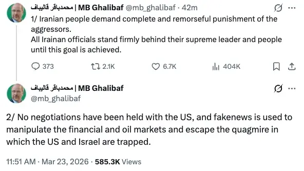 Сепак, набргу потоа, на профилот на Икс, кој му се припишува на Мохамад Багер Галибаф, беше објавено дека со САД не биле водени никакви преговори. Се додава дека „лажни вести“ биле користени за „манипулација“ со нафтените пазари и дека иранскиот народ „бара целосно и покајничко казнување на агресорот“.