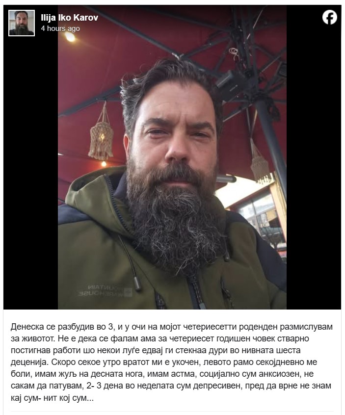 Илија Каров, режисер и сценарист и син на легендарниот Љупчо Бубо Каров, на духовит начин го „најави“ својот 40-ти роденден – со ироничен осврт на сопственото здравје и животните „достигнувања“.