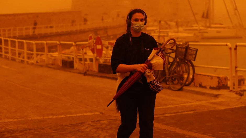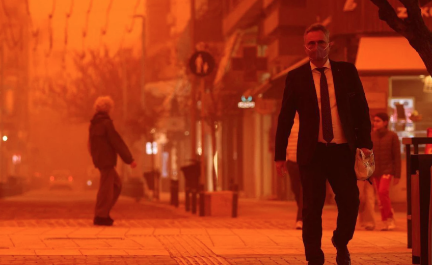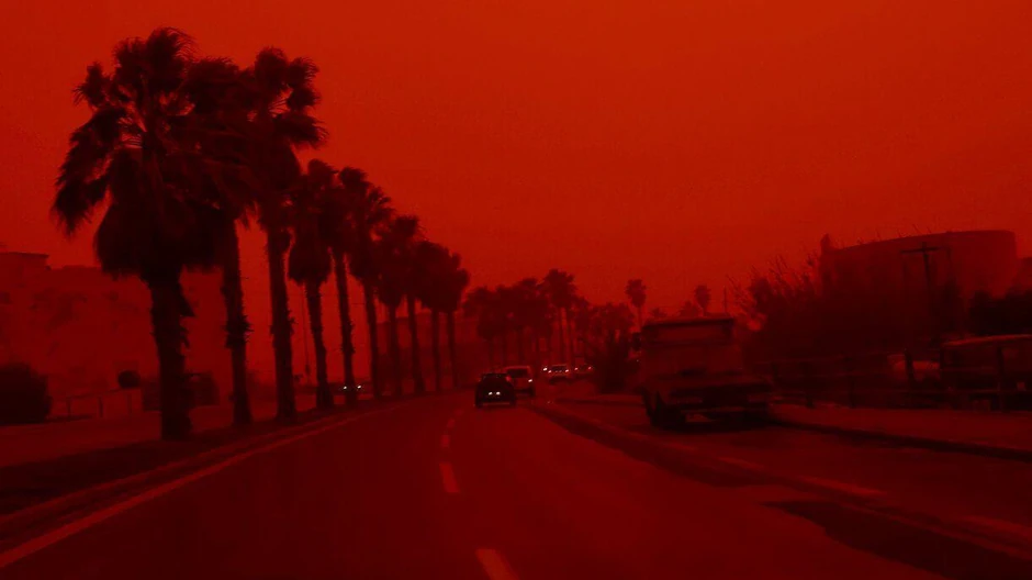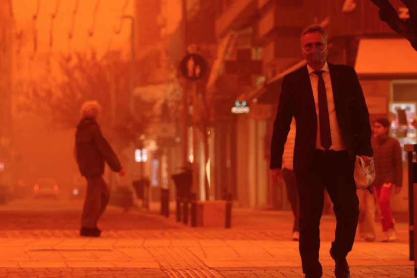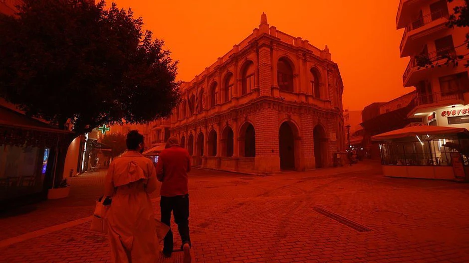 Во меѓувреме, поради пустинскиот песок пристигнат од Африка, небото над Крит, еден од најголемите медитерански острови, доби црвено-портокалова боја.