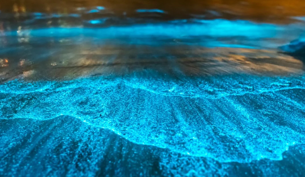 Овие организми се биолуминисцентни планктони, кои ги населуваат водите на Малдивите, кои емитуваат сина светлина кога ќе дојдат во контакт со брановите, ослободувајќи луциферин, хемикалија која, во контакт со кислород, произведува син сјај.