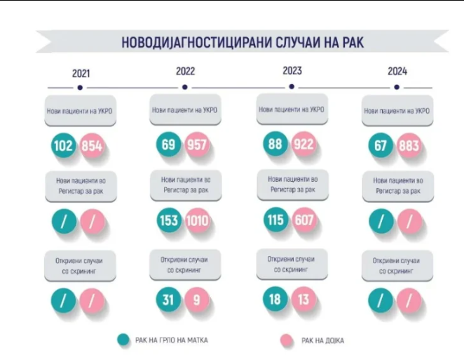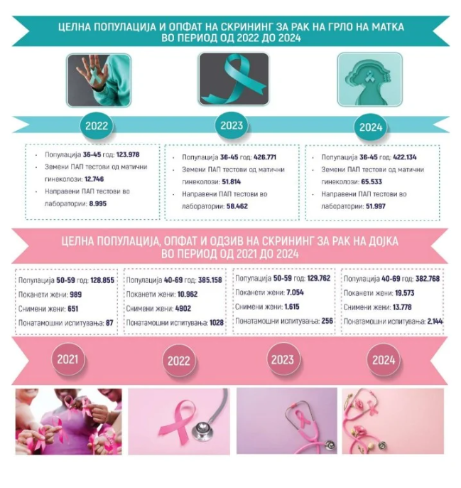 „Скрининг програмите се реализираат континуирано, но опфатот на целната популација е ограничен и не обезбедува значајни популациски ефекти. Анализата покажува дека опфатот на скринингот на рак на дојка се движи од 0,8% до 5,4%, додека кај скринингот на рак на грло на матка од 10,3% до 15,5% од целната популација, што е значително под европските препорачани нивоа за организиран популациски скрининг. Овие податоци упатуваат дека со постојниот опфат не може да се очекува доволен ефект во раното откривање на болеста“, се наведува во извештајот.