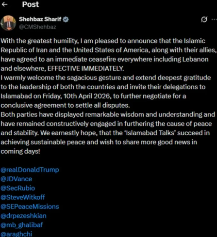 Пакистанскиот премиер Шехбаз Шариф објави дека Исламската Република Иран и САД, заедно со нивните сојузници, се согласиле на моментален прекин на огнот. Според него, прекинот на огнот важи за сите области, вклучително и Либан, и стапува на сила веднаш.