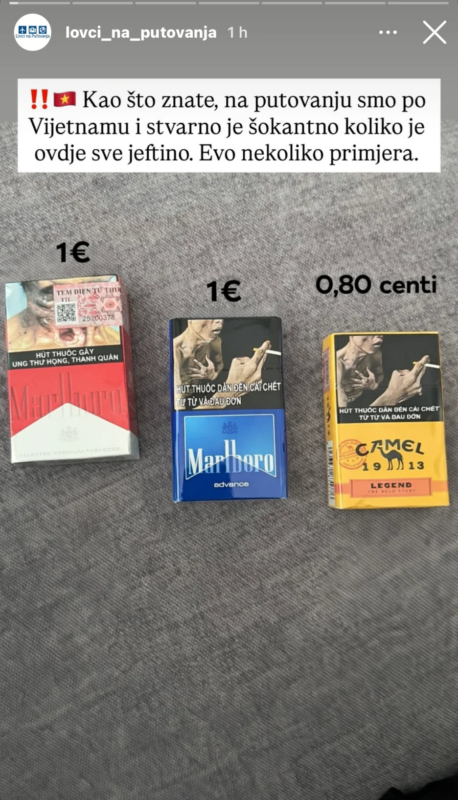 „Како што знаете, на патување сме во Виетнам и навистина е шокантно колку е сè евтино овде. Еве неколку примери“, напишаа тие, споделувајќи фотографија од различни видови цигари, од кои повеќето чинат 1 евро и помалку.