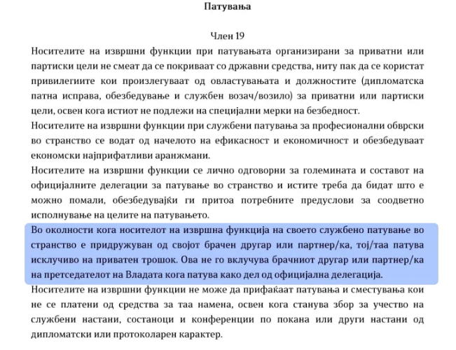 Кодексот за етичко однесување на Владата предвидува функционерите на служби патувања да бидат придружувани од брачните партнери, но трошоците приватно да си ги платат, со исклучок на брачните партнери на премиерите кога се дел од државна делегација. За децата на функционерите нема правила. Тие не се споменати ниту во Кодексот од Владата, ниту пак во уредбата по која работи владината авио-служба. За нив изречно не е ниту дозволено ниту забрането да бидат придружба на родителите-функционери на службените патувања.