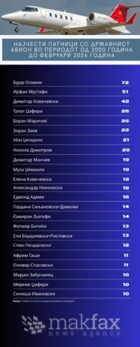Во листата на патници актуелниот премиер Христијан Мицкоски го има на три лета, а најчесто со државниот авион патувала претседателката Гордана Сиљановска-Давкова која имала 14 лета за безмалку две години, колку што е на функцијата.