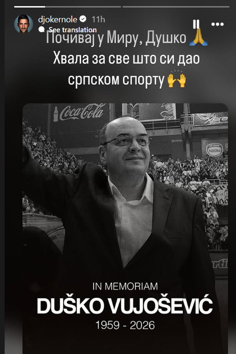 – Душко, почивај во мир. Ти благодарам за се она што му го даде на српскиот спорт, – порача Ѓоковиќ во првото стори, а потоа ја сподели легендарната изјава.