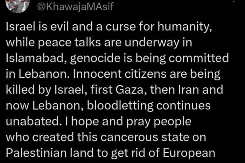Пакистанскиот министер за одбрана, Хаваџа Асиф, избриша објава на Икс во која го нарече Израел „зло и проклетство врз човештвото“.