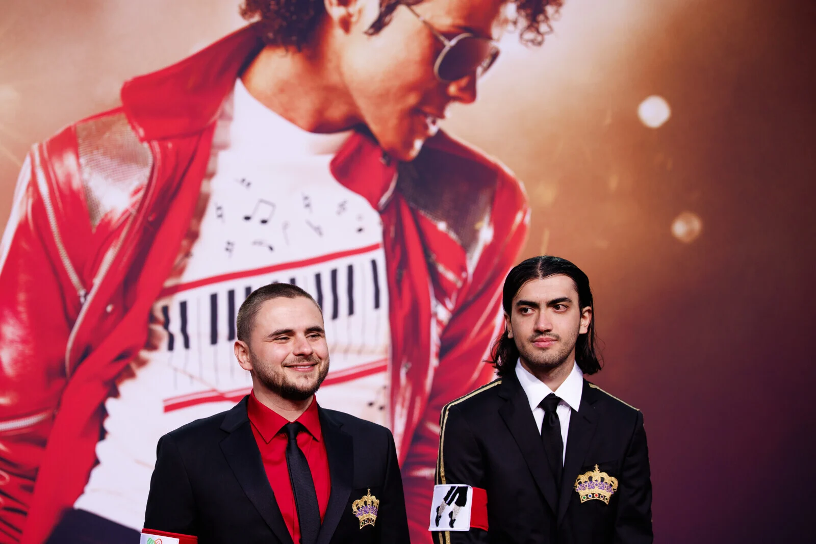 На црвениот тепих позираа во одела кои потсетуваат на модниот стил на нивниот славен татко. Биги на раката носеше лента со фотографија од легендарната танцова поза на Мајкл, во која се наведнува под агол од 45 степени.