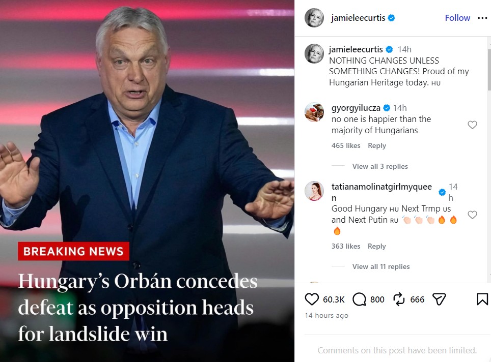 Американската актерка со унгарско потекло Џејми Ли Кертис реагираше на резултатите од парламентарните избори во Унгарија со објава на социјалните мрежи.