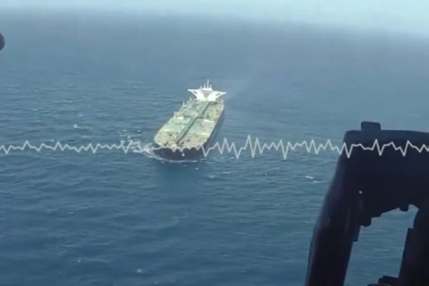Американската воена команда ЦЕНТКОМ објави видео од Оманскиот Залив на кое се гледа воен хеликоптер како придружува трговски брод за време на спроведувањето на поморската блокада на иранските пристаништа.