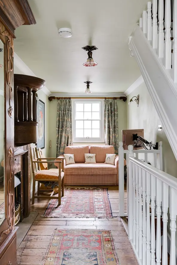 На првиот кат има дневна соба со камин, каде што има место за софа и фотелја, но сигурно нема простор за подиум за танцување.