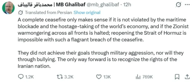 Мохамад Багер Галибаф вчера на платформата Икс објави дека овие „прекршувања“ вклучуваат поморска блокада на иранските пристаништа од страна на САД, која ја нарече „земање на глобалната економија како заложник“, како и „военото потбуцнување на војна на сите фронтови“ од страна на Израел, објавува Би-би-си.