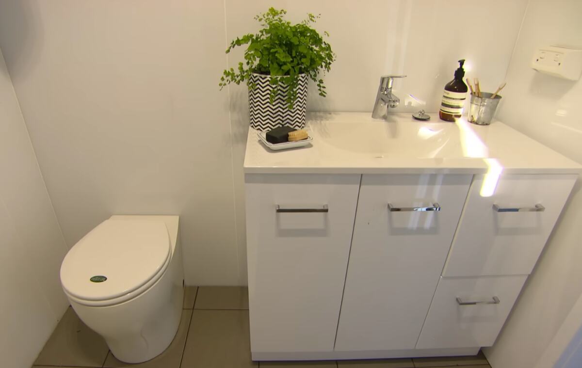 Бањата е опремена со модерни панели, кои се поевтина алтернатива на плочките, а целиот простор е декориран со топли тонови кои создаваат чувство на удобност.