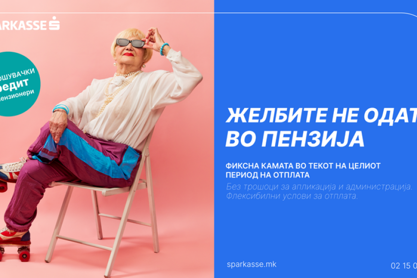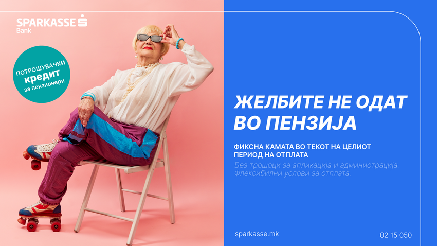 Под слоганот „Желбите не одат во пензија“, Шпаркасе Банка воведува промотивни услови за потрошувачки кредит наменет за пензионери, со цел да обезбеди дополнителна финансиска поддршка и поголема сигурност во секојдневното планирање.