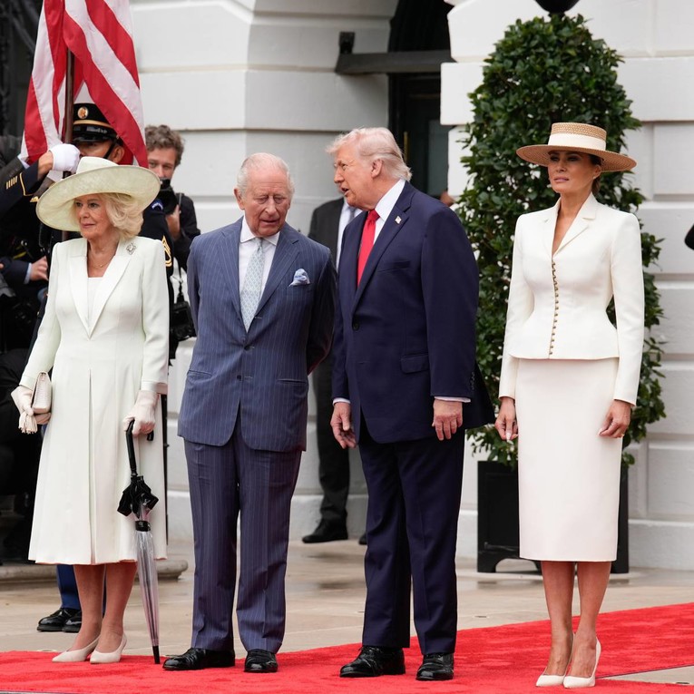 Во рамки на службениот пречек на кралот Чарлс и кралицата Камила на тревникот пред Белата куќа се одржала свечена церемонија, а американските и британските функционери се построиле за да го поздрават кралскиот пар.