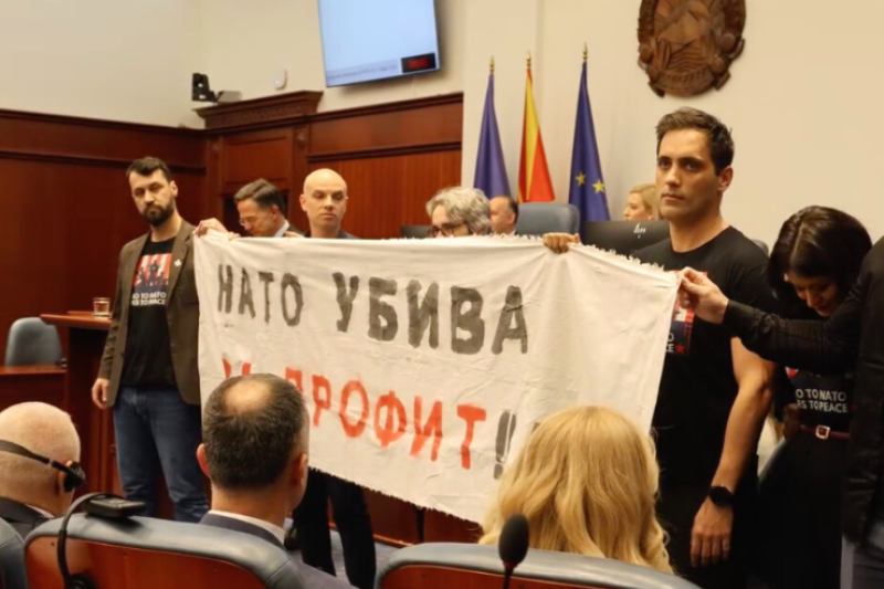Пратениците на Левица излегоа со транспарент „НАТО убива за профит“...